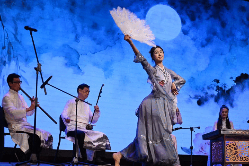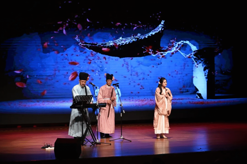 来自中国的丝路乐队以欢快的《欢乐同行》拉开诗词音乐雅集序幕。《杏花天影》的女声吟唱婉转悠扬,《春江花月夜》的乐舞交融令人沉醉,《水调歌头·堂前燕》的改编弹唱深情款款,《海南情思》展现出浓郁的黎族风情,《夜深沉》的京胡铿锵有力,《淡黄柳》的舞蹈与尺八演绎出宋词意境,《送你一朵玫瑰花》的新疆民歌浪漫动人,最后一曲广受新加坡朋友喜爱的《城里的月光》,温暖了在场观众的心房。艺术家们以精湛的技艺将诗词与音乐完美融合,让观众沉浸在”海上生明月,天涯共此时”的意境中,仿佛在一轮明月之下穿越古今,感受中华文化之美。