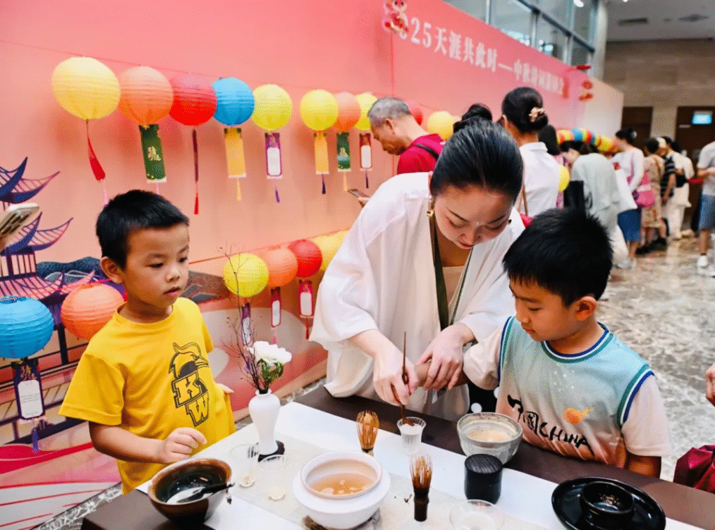 一层大厅的游园活动区热闹非凡,现场装饰着传统花灯,猜灯谜领奖品、宋代点茶体验、茶席品鉴与馅饼品尝等活动吸引了众多民众参与。大家在点茶体验中领略宋代文人的雅致生活,于茶香与美食中品味传统节日的独特韵味。其中,中英文趣味灯谜环节尤其受到家长和小朋友们的欢迎,一家人在猜谜互动中共同感受中秋文化的智慧与乐趣。
