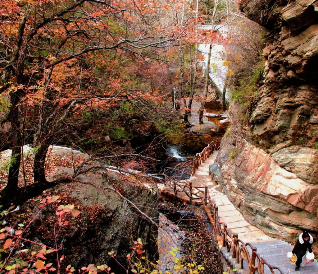 黄金寨的“悬空赏秋”:想换个角度看秋景?坐悬壁小火车吧!列车沿着山体蜿蜒前行,脚下是层林尽染的山谷,耳边是秋风与鸟鸣,随手就能抓拍到“火车穿行红叶间”的惊艳画面。玩累了,再去山间民宿吃顿贴饼子配炖菜,满是烟火气。