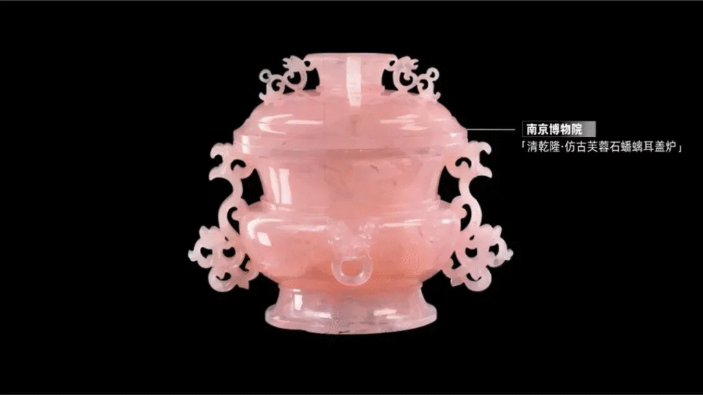 这件清乾隆时期的仿古芙蓉石蟠螭耳盖炉,收藏于南京博物院,通体粉红如霞。整器以整块芙蓉石(又称粉晶)精雕而成,石质脆而易碎,却被匠人琢成高达十余厘米的大型炉体,极为罕见。炉腹两侧饰对称的蟠螭与铺首衔环耳,盖顶四条小蟠螭盘绕相衬,温润中透着皇家气度。