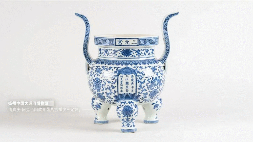 同样藏于扬州中国大运河博物馆的青花八吉祥纹三足炉,是扬州中国大运河博物馆的镇馆之宝之一。炉体胎质细腻,瓷质坚密,外壁以青花绘缠枝八宝纹,象征圆满与祥瑞。
