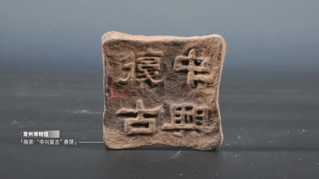 在常州博物馆的展柜中,一块灰色方形香饼格外引人注目。这块南宋·“中兴复古”香饼的正面印有隶书“中兴复古”四字,背面隐约可见双龙纹。