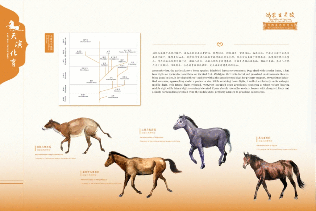 马的演化历程漫长复杂,是脊椎动物适应环境变化的经典范例。早在5800万年前,始祖马就已经存在于植被茂密的灌木林中,伴随自然地理环境变迁,马的演化先后经历了始祖马、中新马、草原古马、三趾马和真马等主要发展阶段。