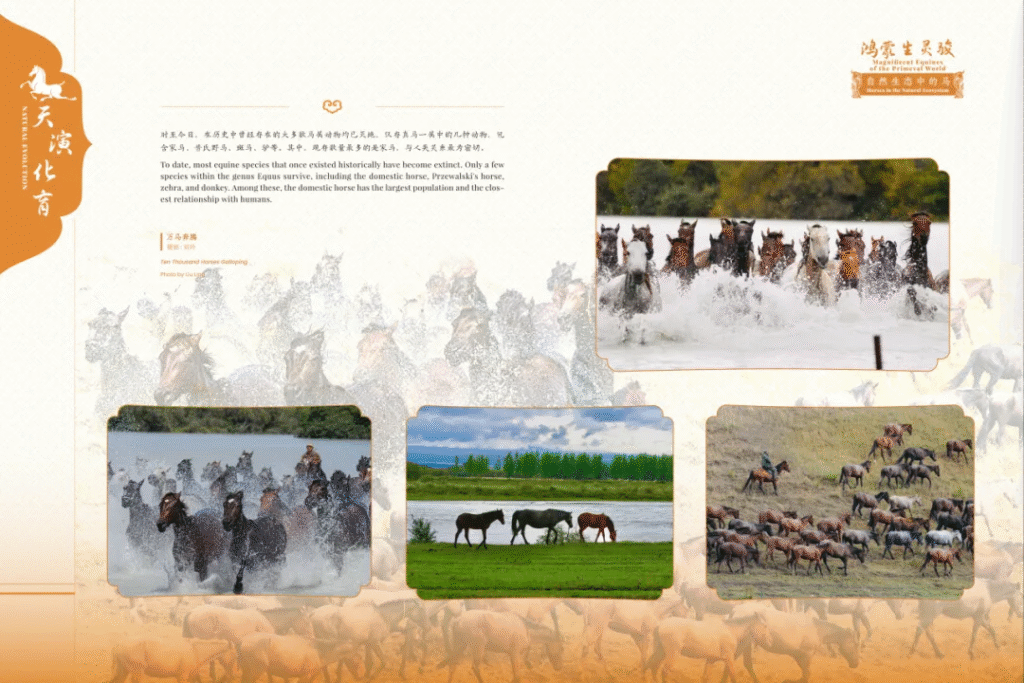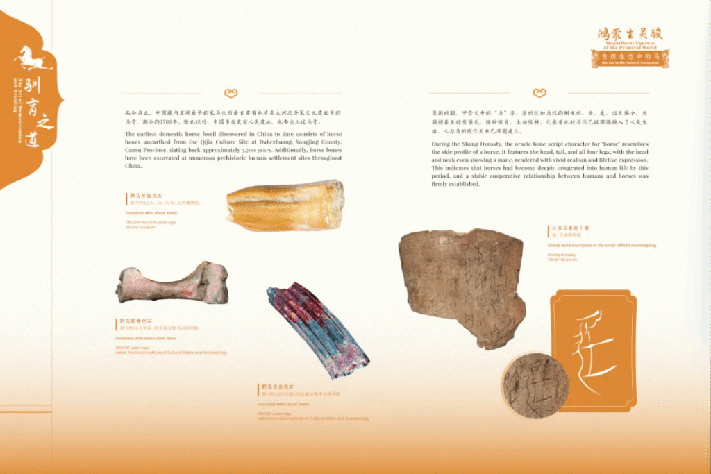 马,属哺乳纲,奇蹄目,马科马属。马属动物的祖先是5800万年前的始祖马,历经物竞天择,逐步演化为扬首高躯的现代马。马广泛分布于全球多个大陆,体格强健,神经敏锐,消化系统发达,适应草食,能够进行持续奔跑与负役行走。中国是最早开始驯化马匹的国家之一,多处史前遗址中都出土过马骨,在百姓的长期实践中还发展出系统性的相马术。随着驯化成功,马逐步融入人们生产生活的诸多领域,成为推动中华文明进程的关键力量。