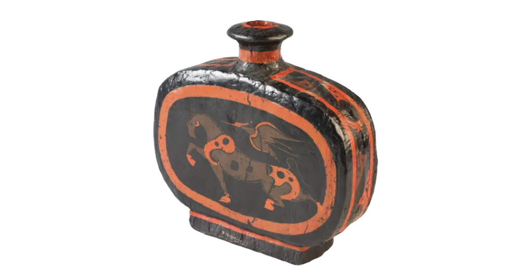 ▲彩绘牛马鸟纹漆扁壶(秦|湖北省博物馆)