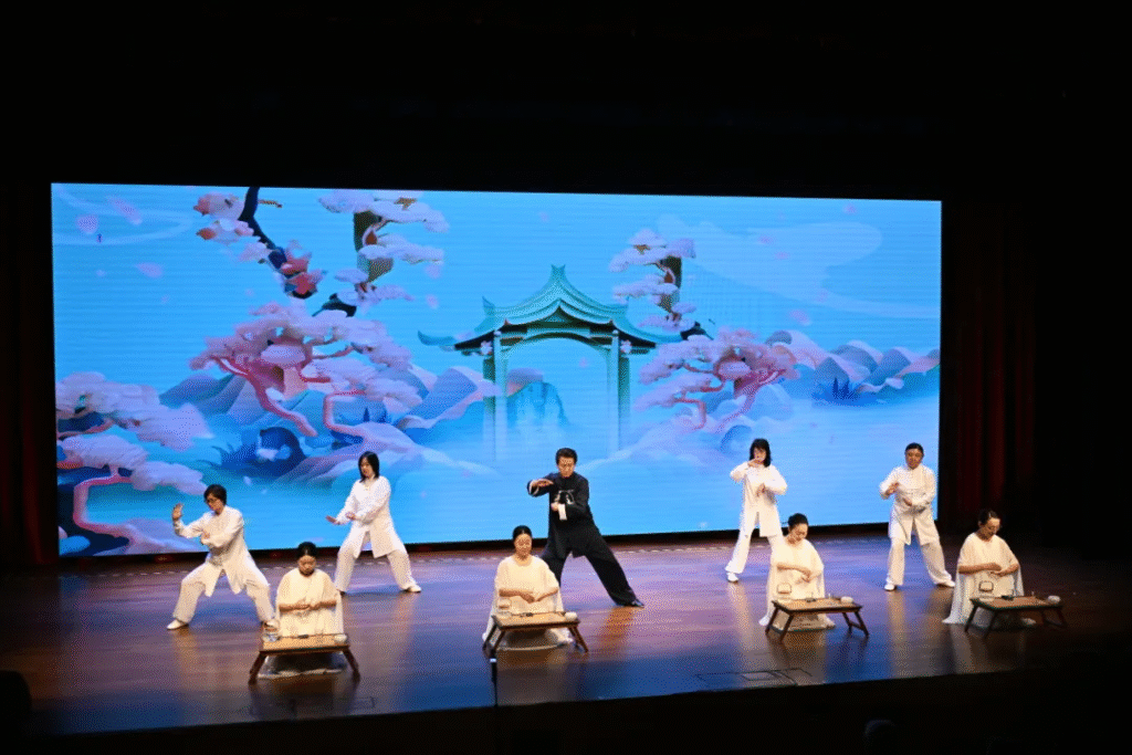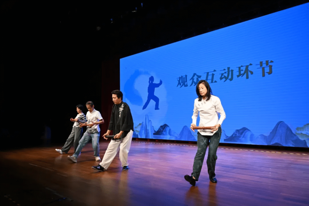 活动还特别设置互动体验环节,邀请观众上台参与。在冯彦博老师指导下,观众认真模仿动作,亲身感受太极棒气功的运劲与节奏。台上台下互动呼应,举手投足之间,现场仿佛化作一片流动的太极课堂,气氛轻松而专注,充分展现了太极文化“人人可学、处处可练”的独特魅力。