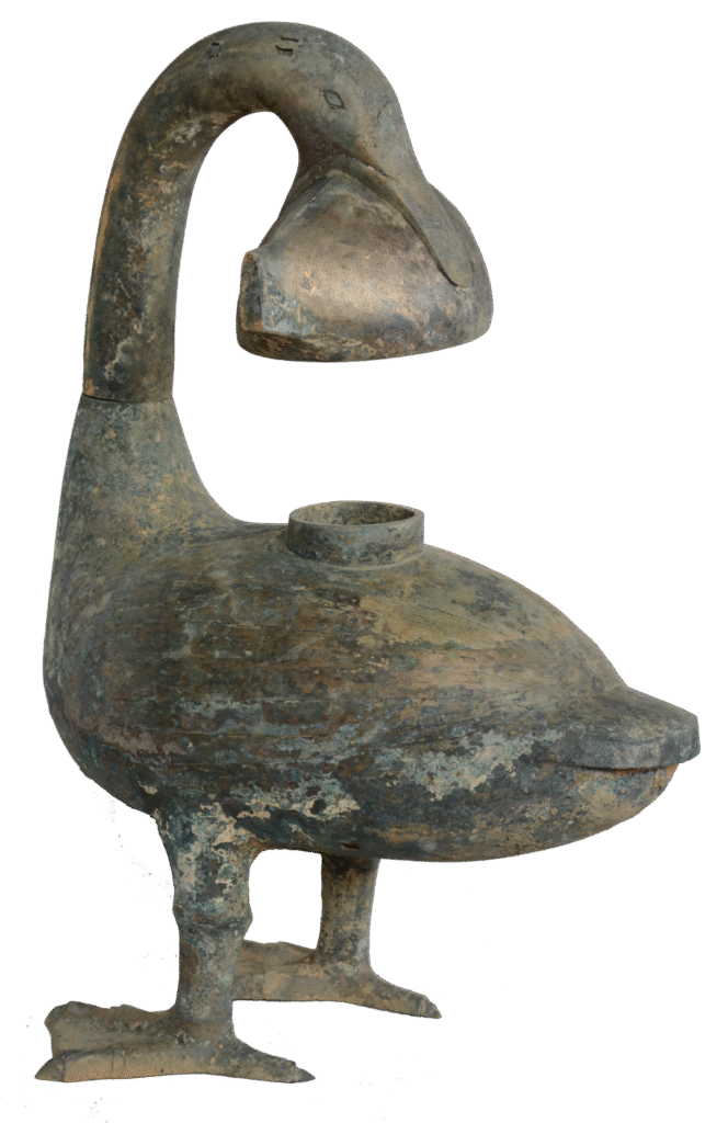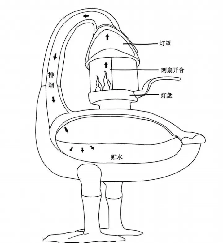 作为一件兼具实用性与观赏性的器物,青铜雁鱼灯的设计处处彰显匠心。整盏灯由雁首颈(连鱼)、雁体、灯盘、灯罩四部分套合而成,各部分以子母口相接,可自由拆装,便于揩拭和清理烟尘,充分考虑了日常使用的便利性。灯盘为圆形,直壁浅腹,内有两道直壁圈沿,一侧附有灯柄,轻轻转动即可控制灯盘,灵活调节灯光亮度与照射角度,适配不同场景的使用需求。最令人称奇的,是它蕴含的“环保黑科技”。雁鱼灯的内里均为空心,鱼身为灯罩,雁颈则作为导烟管,雁腹可盛装清水。汉代灯具的燃料多为动植物油脂,点燃后会产生大量油烟,弥漫室内影响环境。