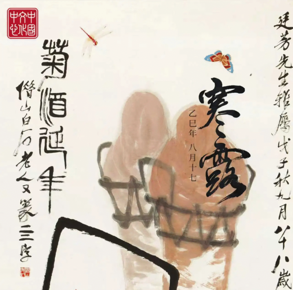 这幅《菊酒延年》创作于1948年,齐白石已变法成熟、渐入化境,此时他笔下的“菊酒”,就像他从园中采来的一样,自然洒脱。