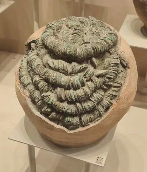 将钱币整齐地串成一串并堆放在陶罐中