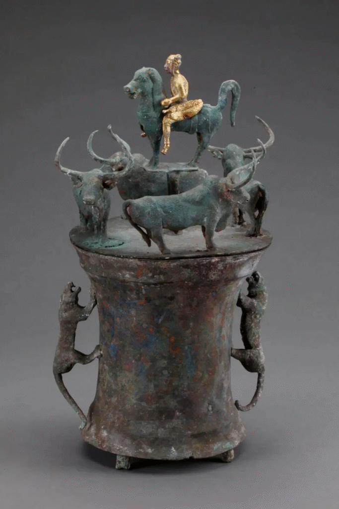 △ 四牛鎏金骑士铜贮贝器 云南省博物馆藏