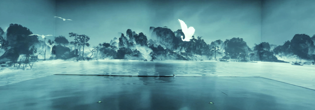 展览的沉浸式体验区,依托中国古代书画和当代数字科技,通过多台8000流明激光投影仪,以一种全新的体验方式让您“走”入画中。整个空间内山脉流动、云雾缭绕,众多中国古代绘画元素“活起来”了,塑造出跨越多朝代、融合多幅精品的沉浸式画境空间。